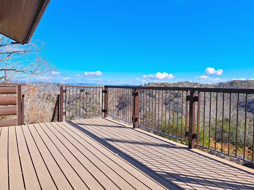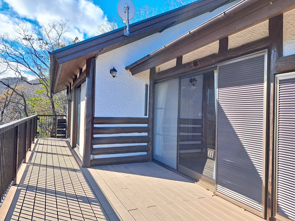 奥行き十分の樹脂製デッキからの眺望が抜群で、眼下に広がるドッグランへ行き来する階段が備わっています。