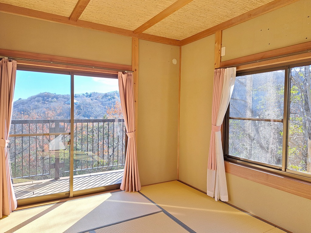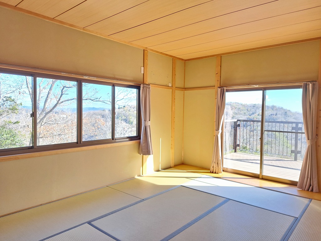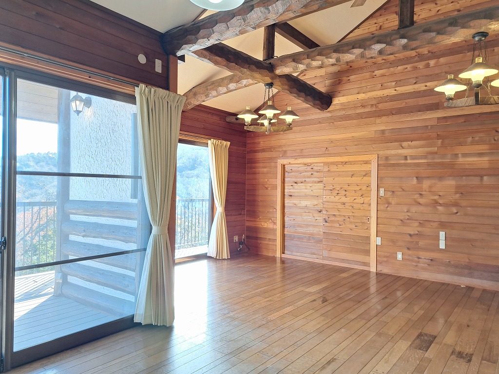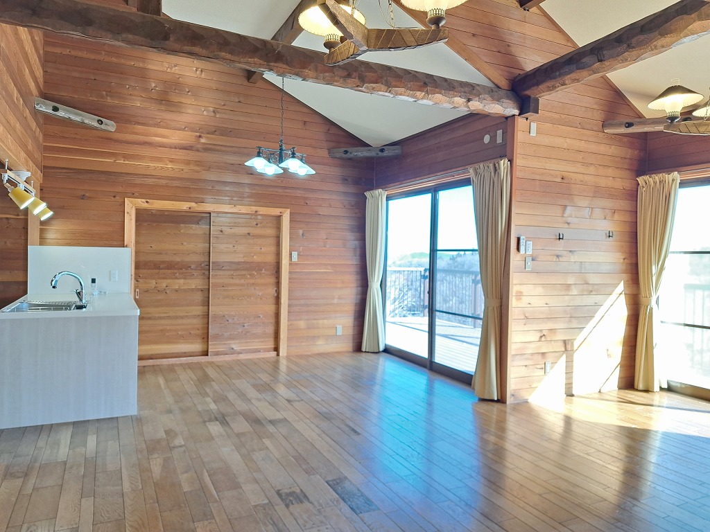 間取りは2LDKで、吹抜け仕様の広いリビングからは山並みを見渡せるようになっています。